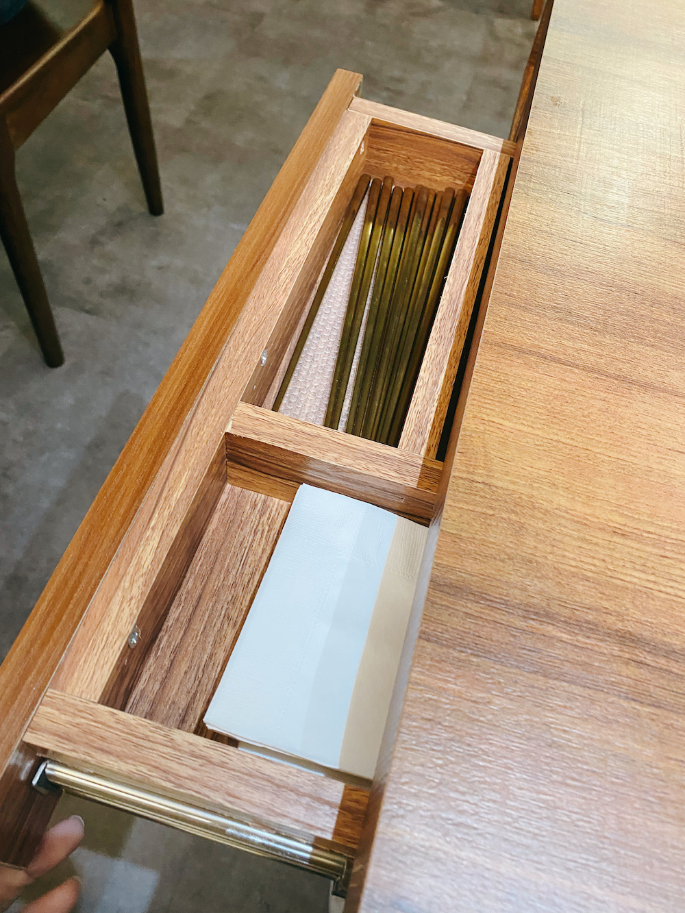 桌邊抽屜裡放著餐具和餐巾紙。